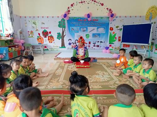 Hình ảnh giáo viên Phạm Thị Hoàng Yến và học sinh của của lớp ghép Bản Hin trong giờ âm nhạc