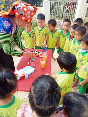 Hình ảnh giáo viên Quàng Thị Hồng lớp nhà trẻ A1 trung tâm trong giờ dạo chơi ngoài trời