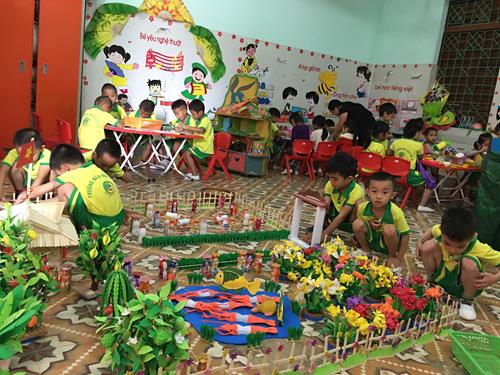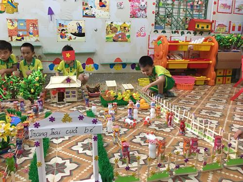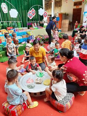 Hình ảnh góc chơi xây dựng lớp MG Lớn bản Phủ. Thông qua vui chơi, hành động chơi với những mối quan hệ với bạn bè cùng chơi giúp trẻ tiếp thu những kinh nghiệm xã hội, mở ra một chặng đường phát triển mới về chất. Đó là giai đoạn đầu tiên của quá trình hình thành nhân cách, là phương tiện để phát triển toàn diện nhân cách.