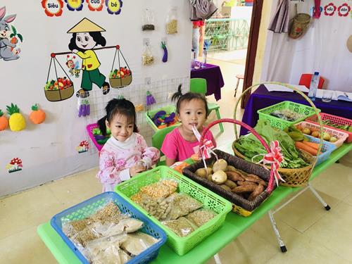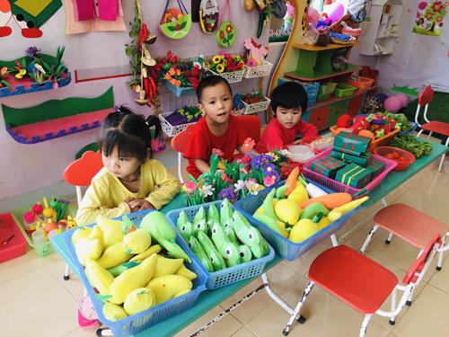 Hình ảnh góc chơi bán hàng MG Bé bản Phủ. Các bé đang phản ánh hoạt động xã hội của người bán hàng. trong quá trình chơi, có sự phối hợp giữa các thành viên trong nhóm chơi với nhau, đã phản ánh một mặt nào đó của xã hội người lớn nên trò chơi mang tính chất xã hội